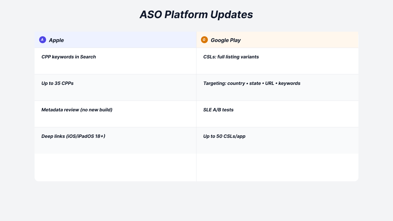 Apple: You can assign keywords to Custom Product Pages, allowing those pages to appear in search results instead of the default product page. You can create up to 35 Custom Product Pages per app. You can submit new updates to review without a new build release. Custom Product Pages support deep links that can open app destinations on iOS and iPadOS 18 and later.