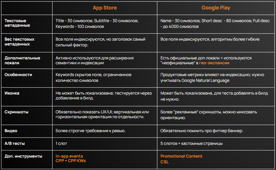 Таблица фиксирует ключевые отличия ASO между App Store и Google Play: от текстовых полей до медиа-ассетов и экспериментальных инструментов.
