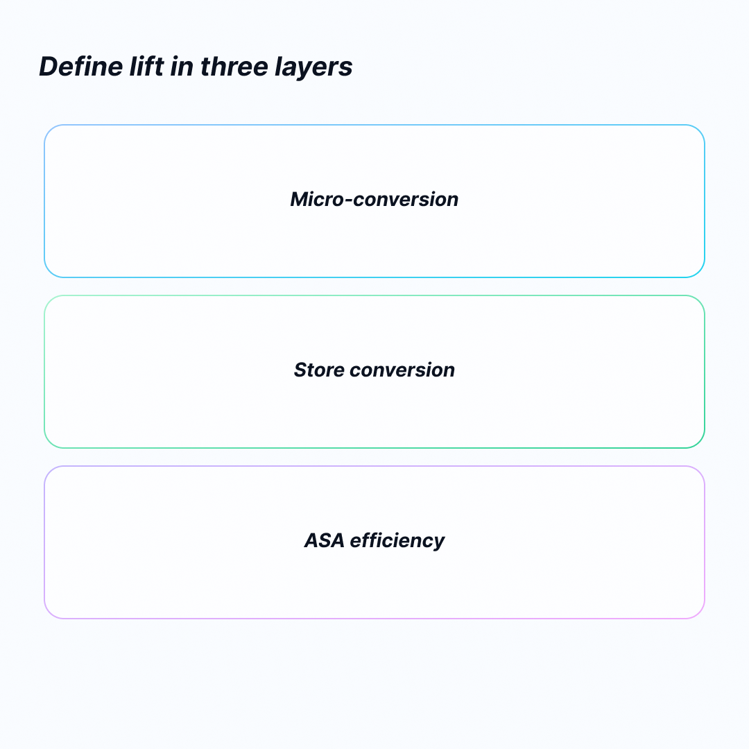 Track three metrics: store conversion rate changes, ASA tap-to-install conversion, and cost per acquisition at constant bids. Use a holdout country or user segment to establish a baseline. Improvement typically appears within two to four weeks.